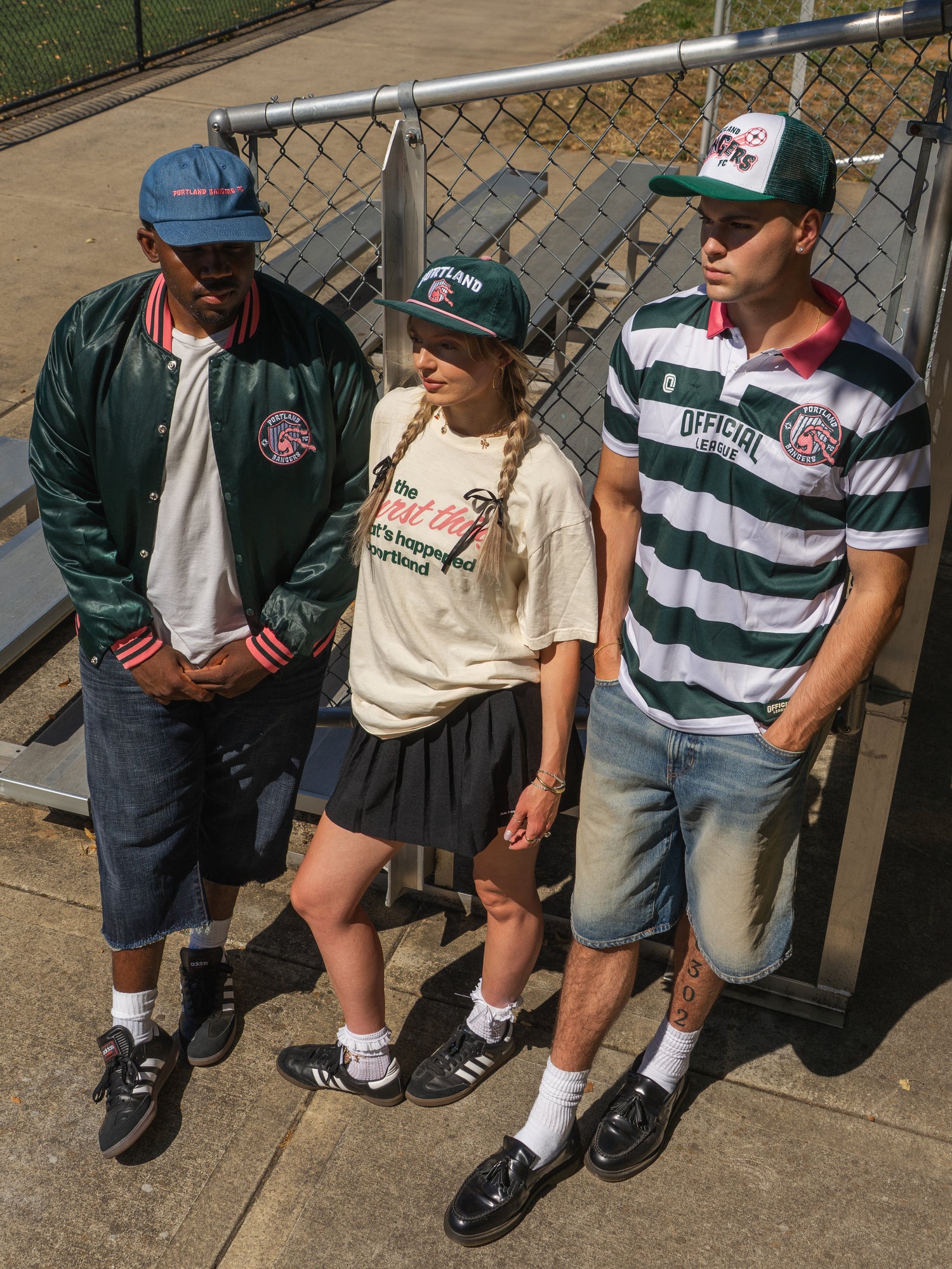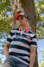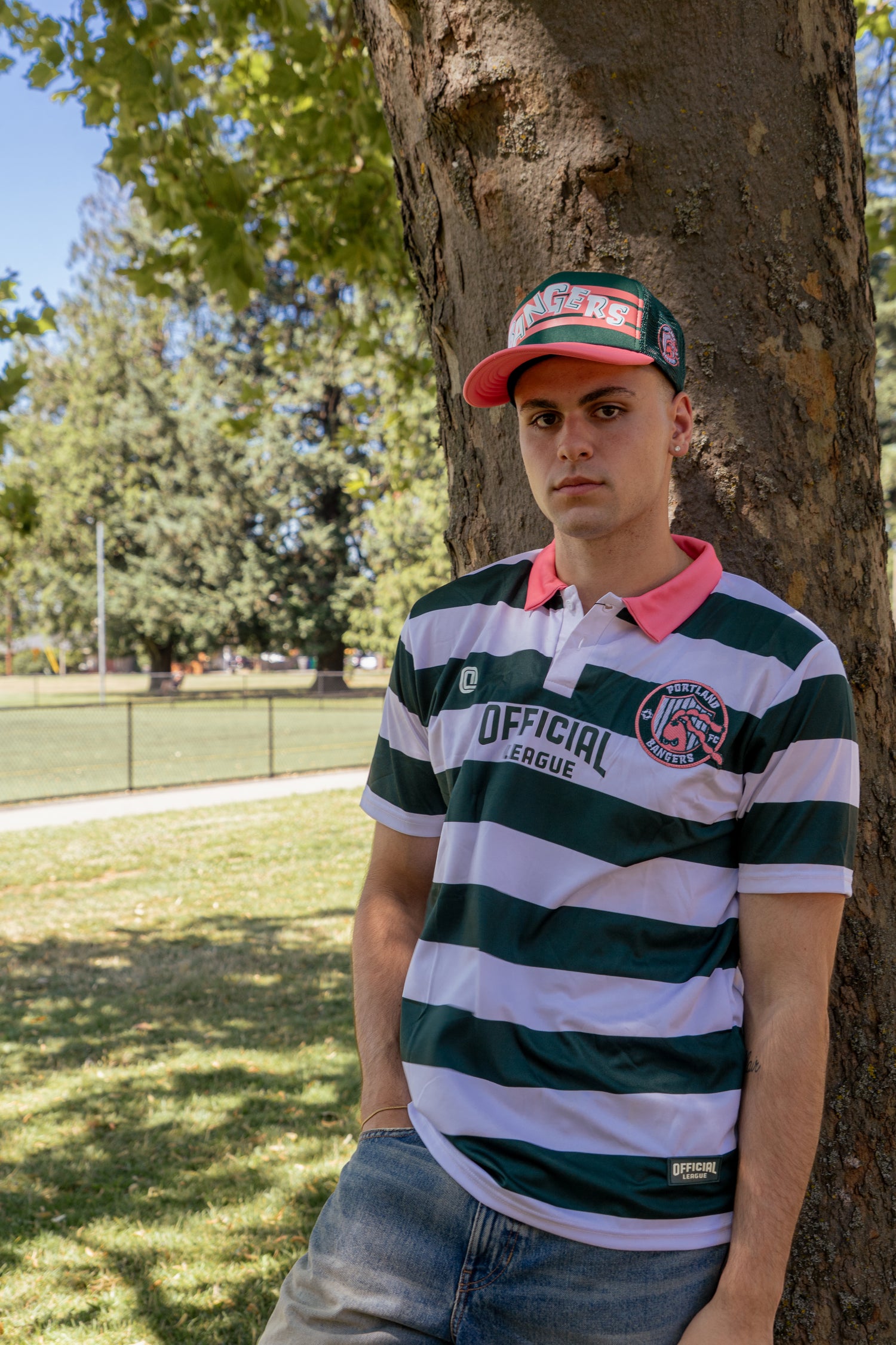 Thick forest green stripes meet a bold pink collar in this casual classic. A vintage-inspired design, it’s a kit made for laid-back afternoons and local pride.